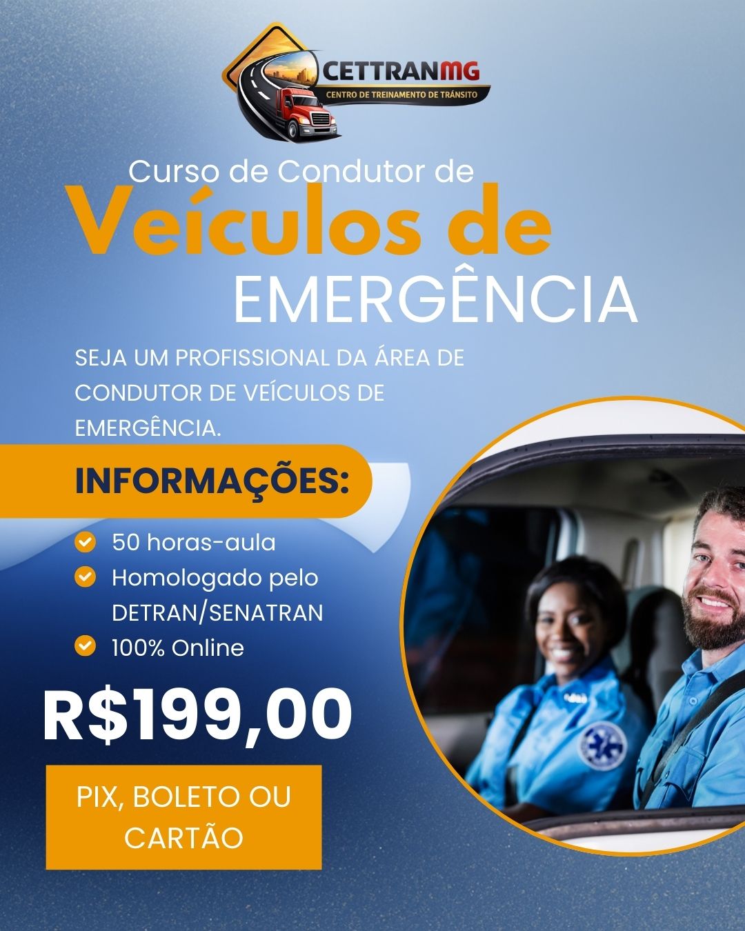 • O Curso de Condutor de Veículos de Emergência capacita profissionais para conduzir ambulâncias, viaturas, veículos de resgate e apoio em situações críticas, com segurança, agilidade e responsabilidade. Ideal para profissionais da saúde, segurança, resgate e motoristas que atuam em serviços emergenciais. Com 50 horas-aula, na modalidade 100% online, o curso é homologado pelo DETRAN/SENATRAN, conforme exigência legal para esse tipo de atuação. Comprou? Nos envie um WhatsApp! (31) 99613-4997