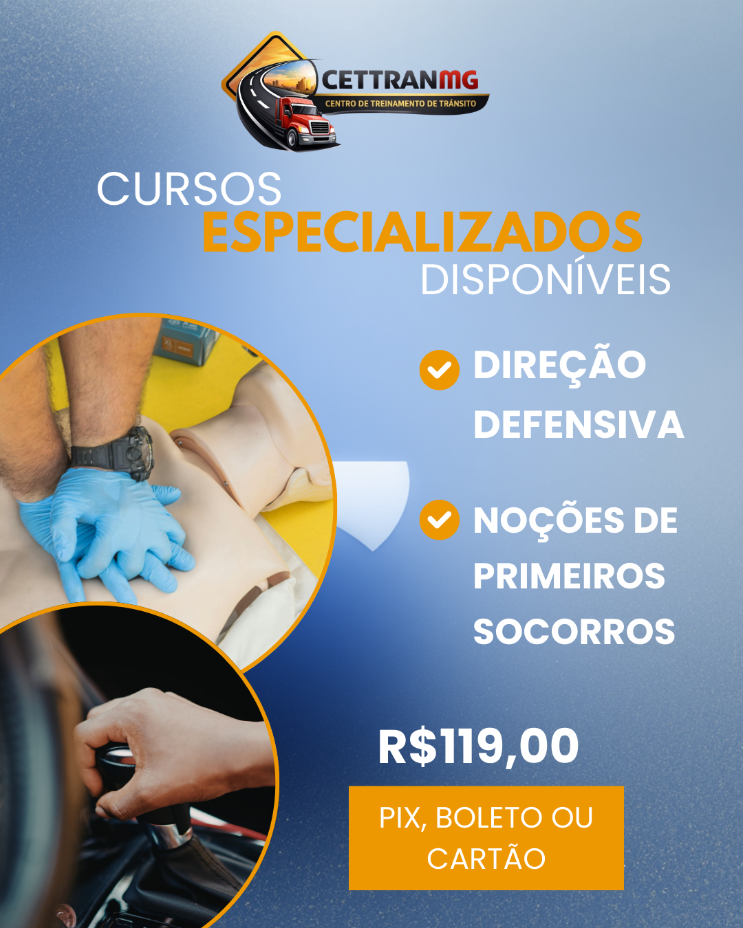 • Direção Defensiva: 15 horas-aula. Curso voltado para prevenir acidentes, ensinar técnicas de condução segura, percepção de riscos e atitudes responsáveis no trânsito, protegendo o condutor, passageiros e terceiros. Noções de Primeiros Socorros: 10 horas-aula. Capacita o aluno a agir corretamente em emergências, prestando os primeiros atendimentos até a chegada do socorro profissional, salvando vidas e evitando agravamentos. Comprou? Nos envie um WhatsApp! (31) 99613-4997