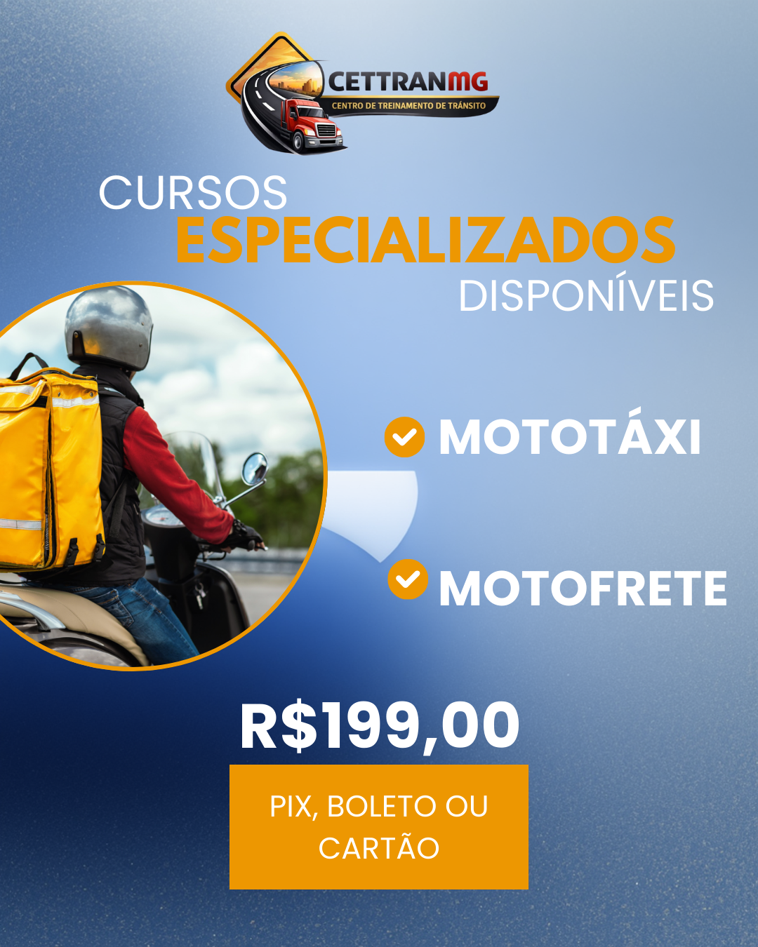 • Mototáxi: 30 horas-aula. Curso que capacita o condutor para o transporte seguro de passageiros, com foco em direção responsável, legislação, prevenção de acidentes e atendimento ao cliente. Motoboy (Motofrete): 30 horas-aula. Treinamento para entregas com segurança e agilidade, abordando condução defensiva, organização de cargas, normas de trânsito e redução de riscos no dia a dia. Comprou? Nos envie um WhatsApp! (31) 99613-4997